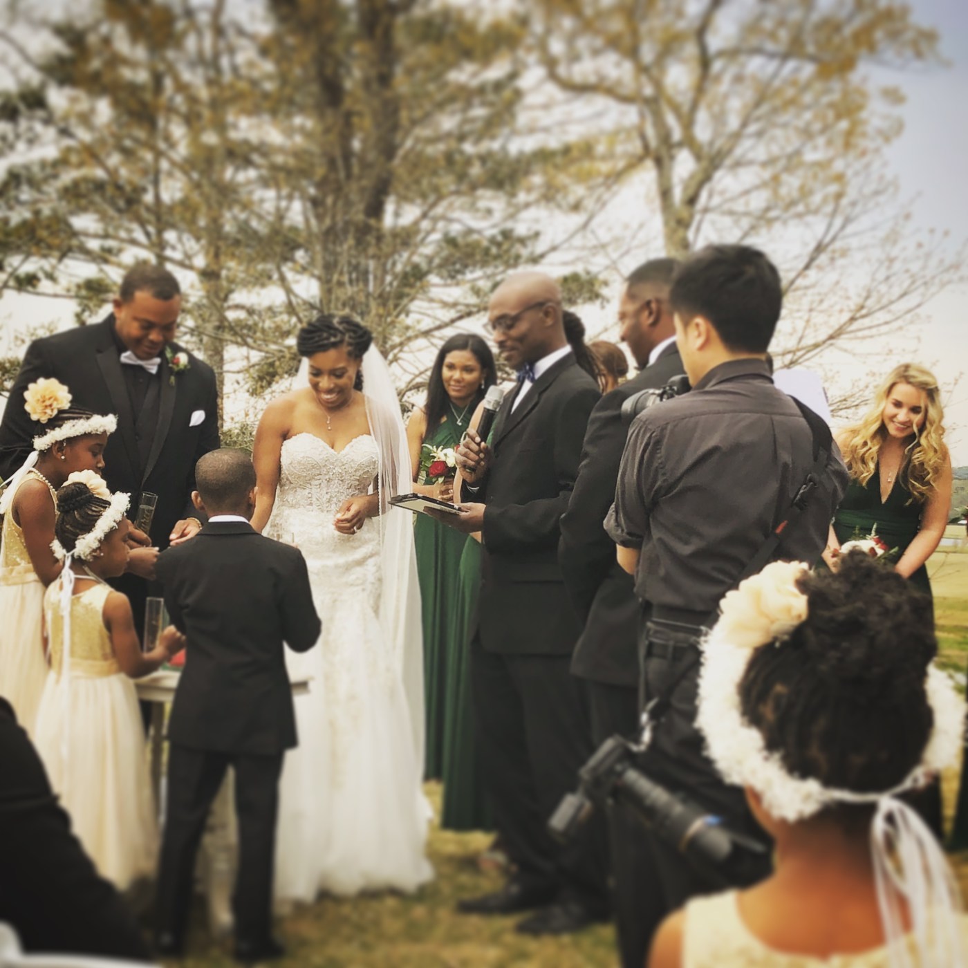 The ceremony was at the top of a rolling Georgia hill just west of Atlanta. Below us, a sweeping expanse of warm wheat fields and rough gravel drives. Above us, a decoupaged sky of chipped gray flakes and tissue paper clouds. To the side, a small, serene lake. Behind and to the right, a riotous bank of hot pink azaleas. If they’d been gold – and sunflowers – I would’ve sworn we’d been painted into a Van Gogh landscape.